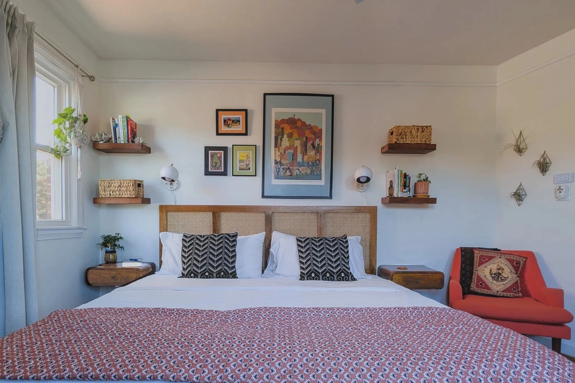 A small bedroom with limited storage and heavy finishes became a light, open retreat through a balance of function and feeling. This redesign blends mid-century structure and bohemian warmth—using secondhand finds, customized details, and a layered palette to create a space that feels both personal and restorative.