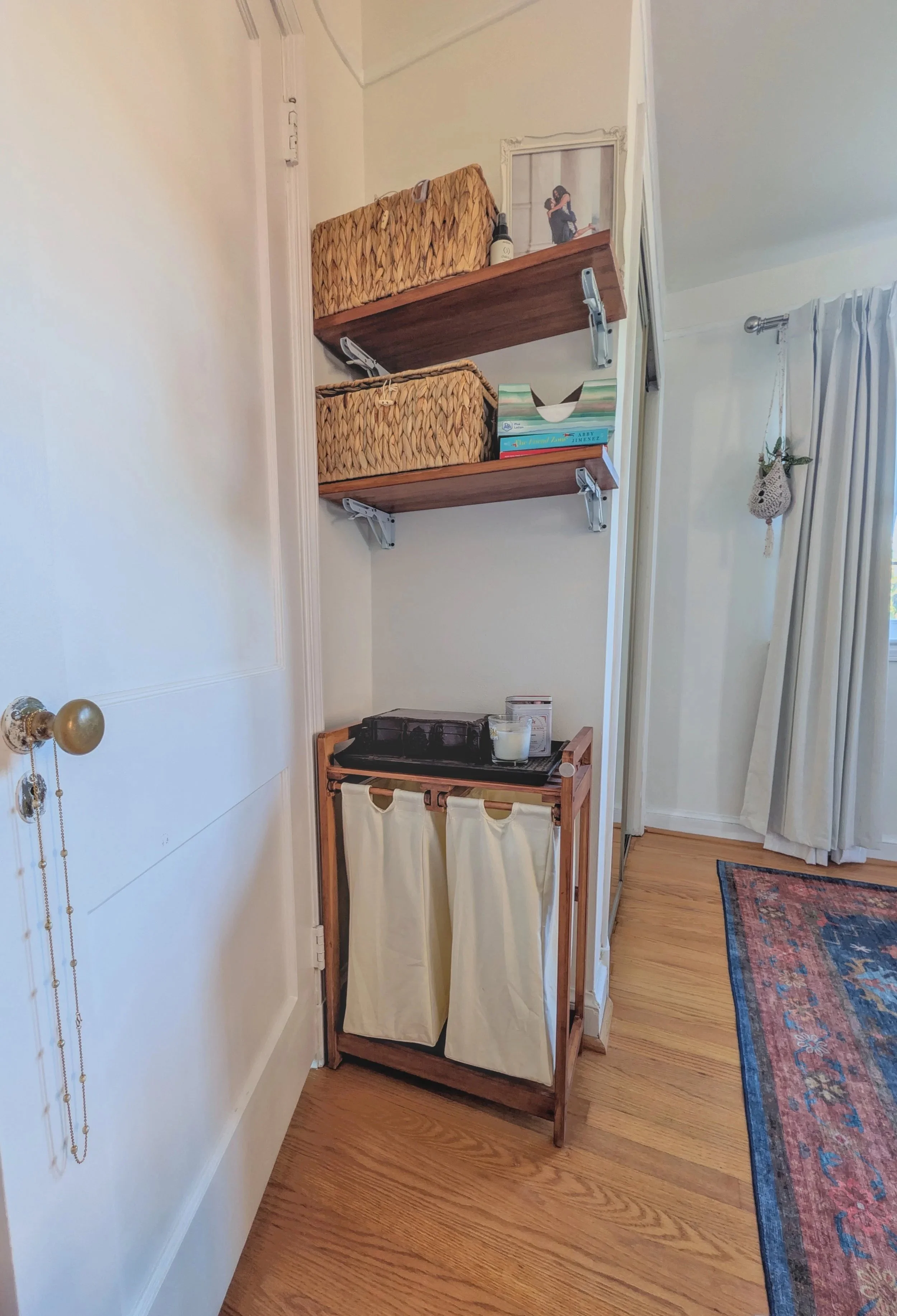 The Solution: A strategic redesign that achieved both functional mastery and personal style. The redesign started with a foundational palette shift, then integrated existing, second-hand, and new finds and customized solutions to address challenging storage limitations. The result is a highly efficient space where every element—from the layered textiles to the functional lighting—captured the owners’ style and their need to unwind and recharge.