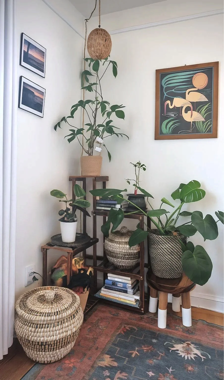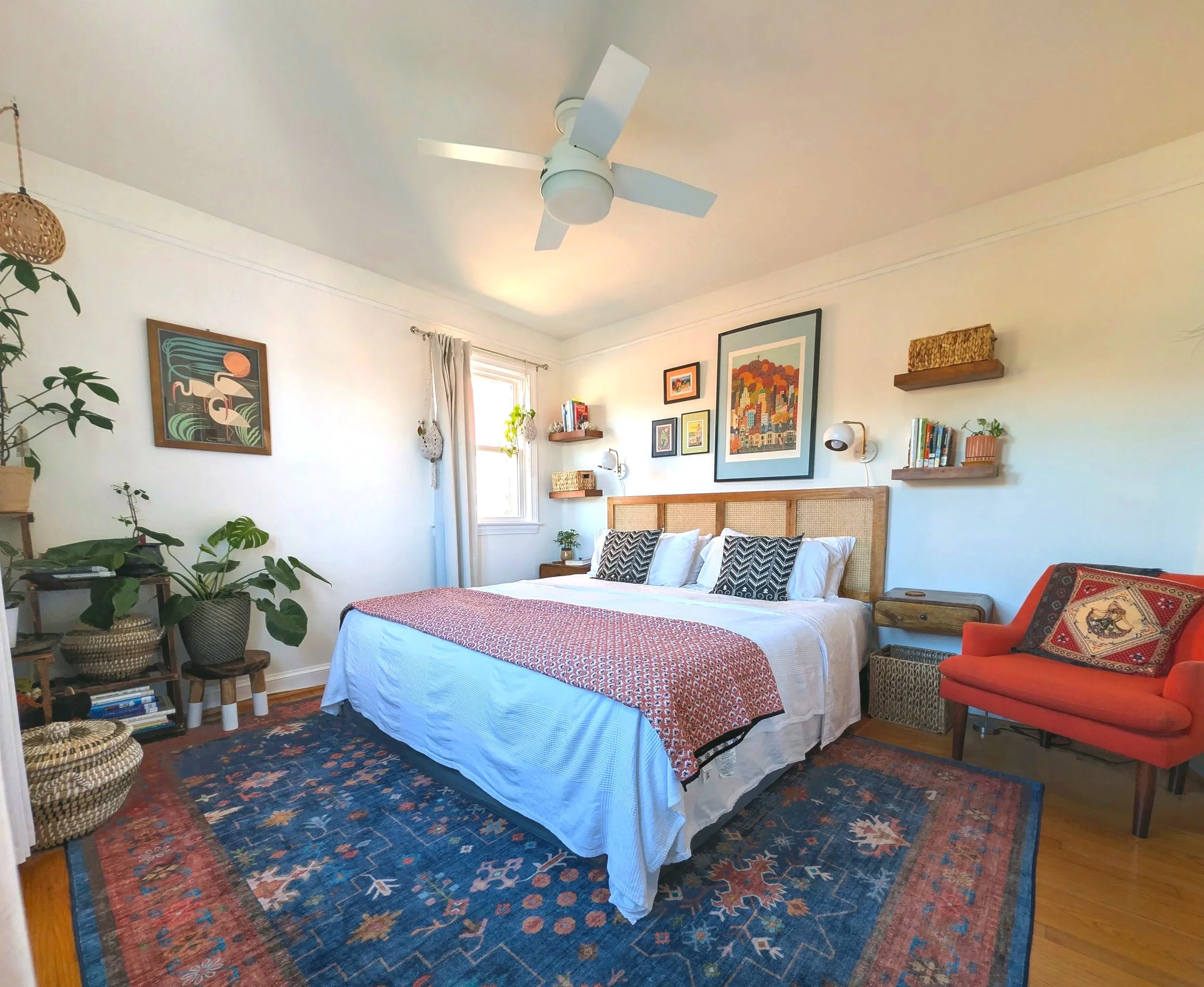 The Challenge: Transform an understated D.C. bedroom with cool-toned palette and scattered decorative elements into an open, airy, mid-century modern/bohemian retreat.